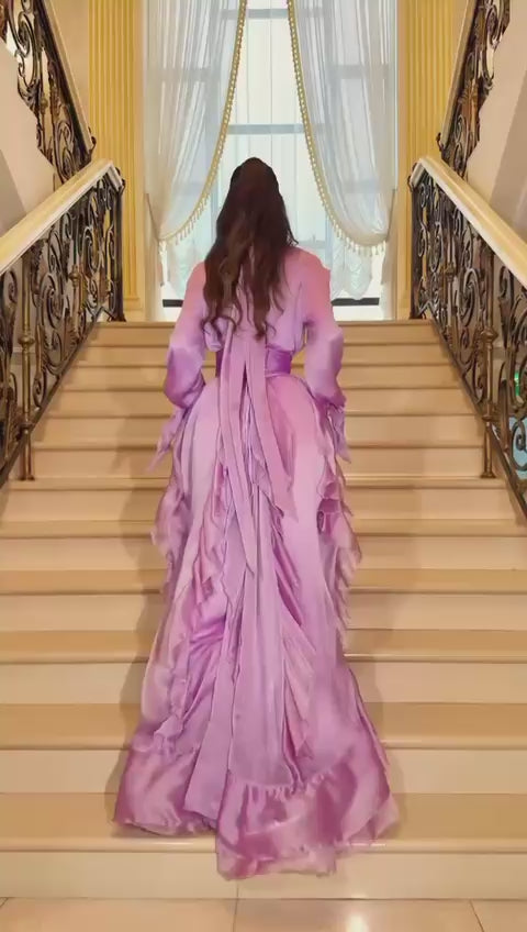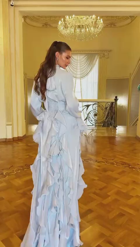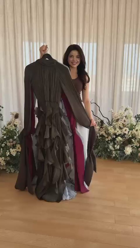 • Length: Full-length gown with cascading ruffles that drape elegantly to the floor.